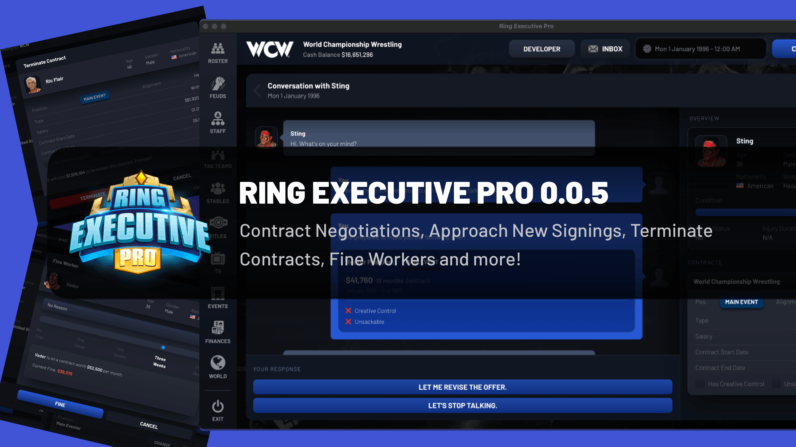 Ring Executive Pro is the "Football Manager" of wrestling games. It lets you take full control of your own wrestling promotion. From managing your roster, booking shows, dealing with the networks and handling rival promoters.